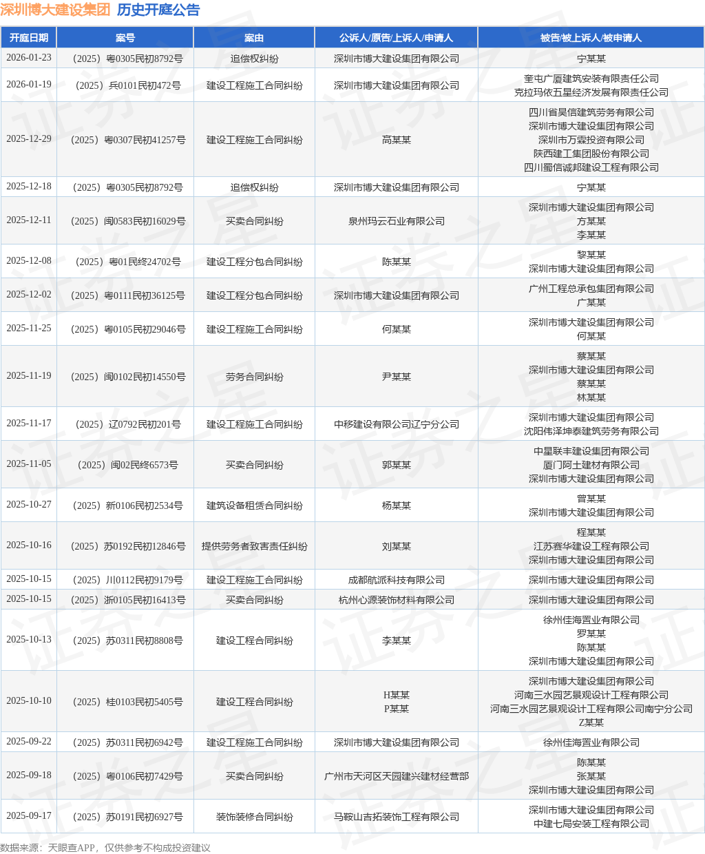 案号:(2025)粤01民终24702号根据统计,近一年内以深圳市博大建设集团有限公司为当事人的历史开庭公告有189则,其中案由为“劳务合同纠纷”的公告以57则居首,其次为“买卖合同纠纷”有29则,“建设工程施工合同纠纷”有24则。历史开庭公告(前20条)如下: