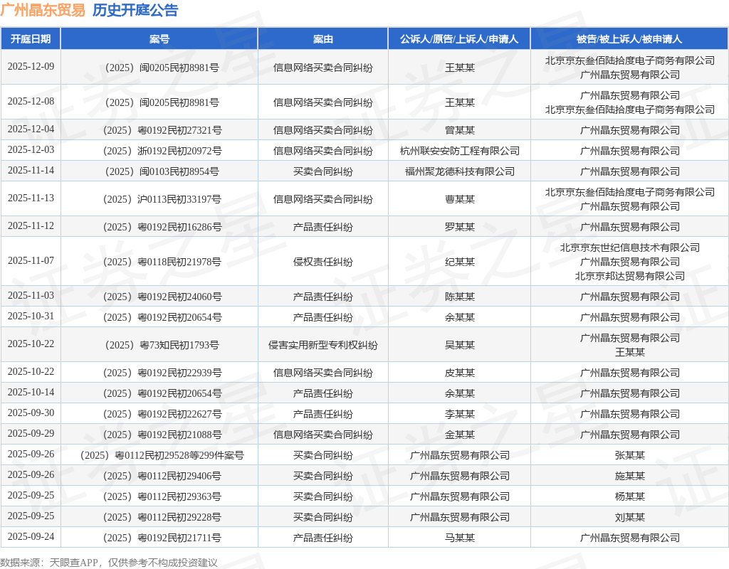 案号:(2025)闽0205民初8981号根据统计,近一年内以广州晶东贸易有限公司为当事人的历史开庭公告有139则,其中案由为“信息网络买卖合同纠纷”的公告以48则居首,其次为“买卖合同纠纷”有32则,“产品责任纠纷”有26则。历史开庭公告(前20条)如下: