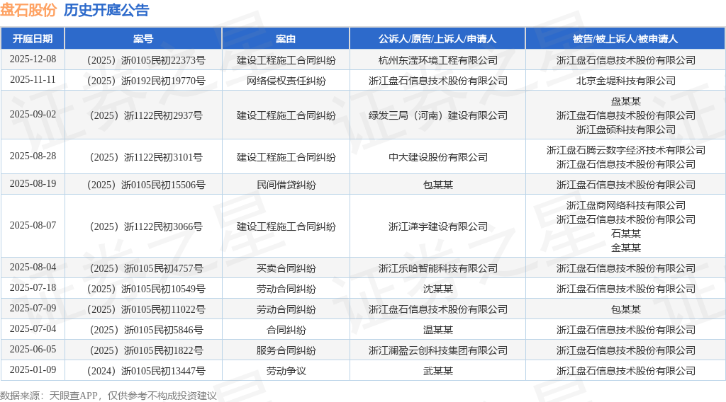 案号:(2025)浙0105民初22373号根据统计,近一年内以浙江盘石信息技术股份有限公司为当事人的历史开庭公告有12则,其中案由为“建设工程施工合同纠纷”的公告以4则居首,其次为“劳动合同纠纷”有2则,“买卖合同纠纷”有1则。历史开庭公告如下:
