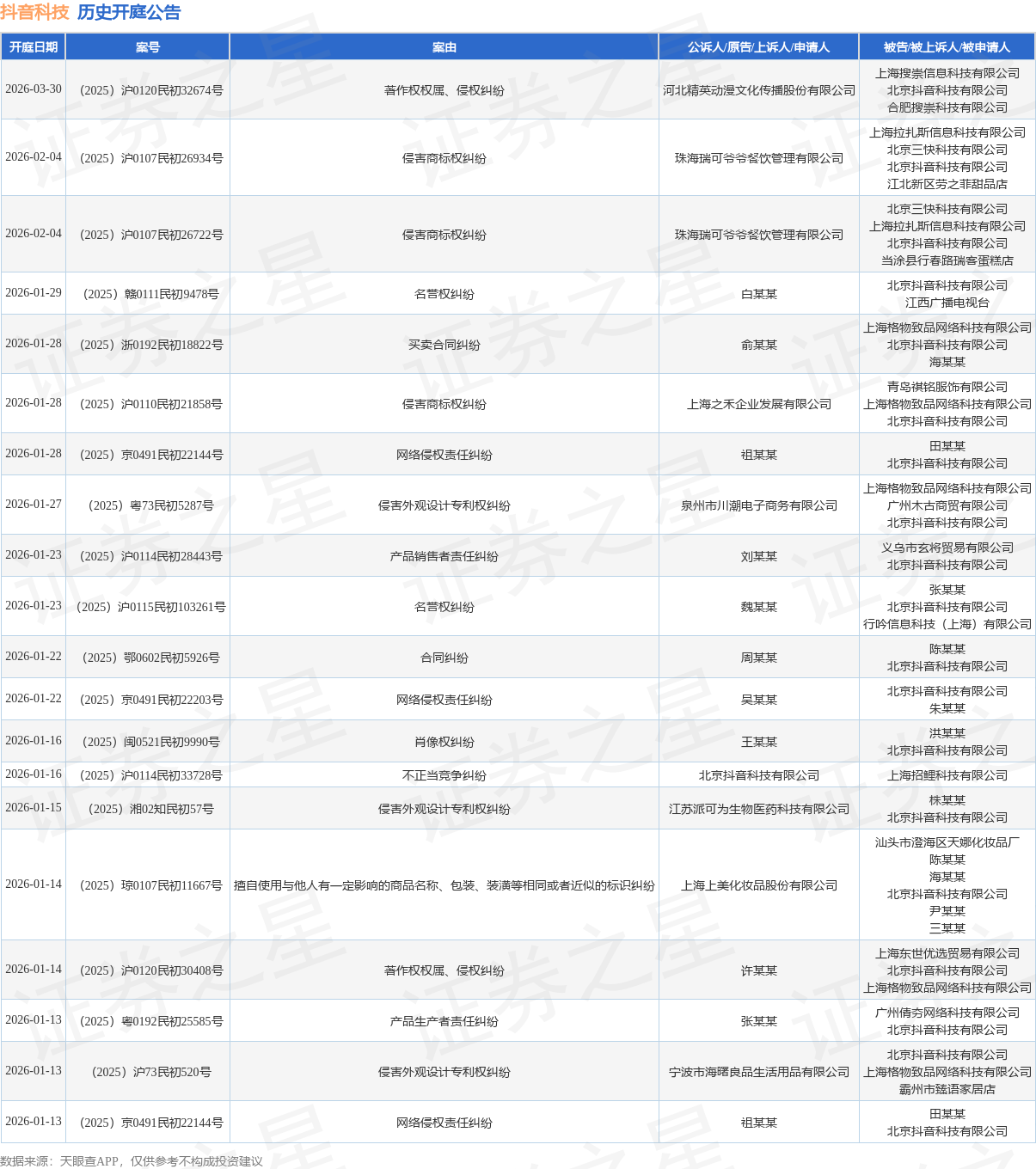 案号:(2025)桂0107民初15932号根据统计,近一年内以北京抖音科技有限公司为当事人的历史开庭公告有1627则,其中案由为“侵害外观设计专利权纠纷”的公告以204则居首,其次为“侵害商标权纠纷”有175则,“侵害作品信息网络传播权纠纷”有170则。历史开庭公告(前20条)如下:
