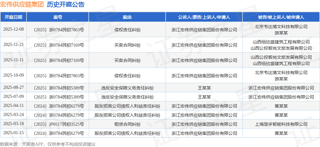 案号:(2025)浙0784民初7863号根据统计,近一年内以浙江宏伟供应链集团股份有限公司为当事人的历史开庭公告有10则,其中案由为“股东损害公司债权人利益责任纠纷”的公告以3则居首,其次为“买卖合同纠纷”有2则,“侵权责任纠纷”有2则。历史开庭公告如下: