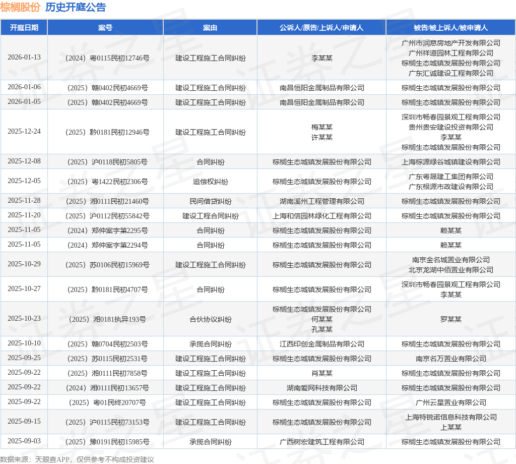 案号:(2025)沪0118民初5805号根据统计,近一年内以棕榈生态城镇发展股份有限公司为当事人的历史开庭公告有138则,其中案由为“建设工程施工合同纠纷”的公告以69则居首,其次为“建设工程合同纠纷”有10则,“承揽合同纠纷”有7则。历史开庭公告(前20条)如下: