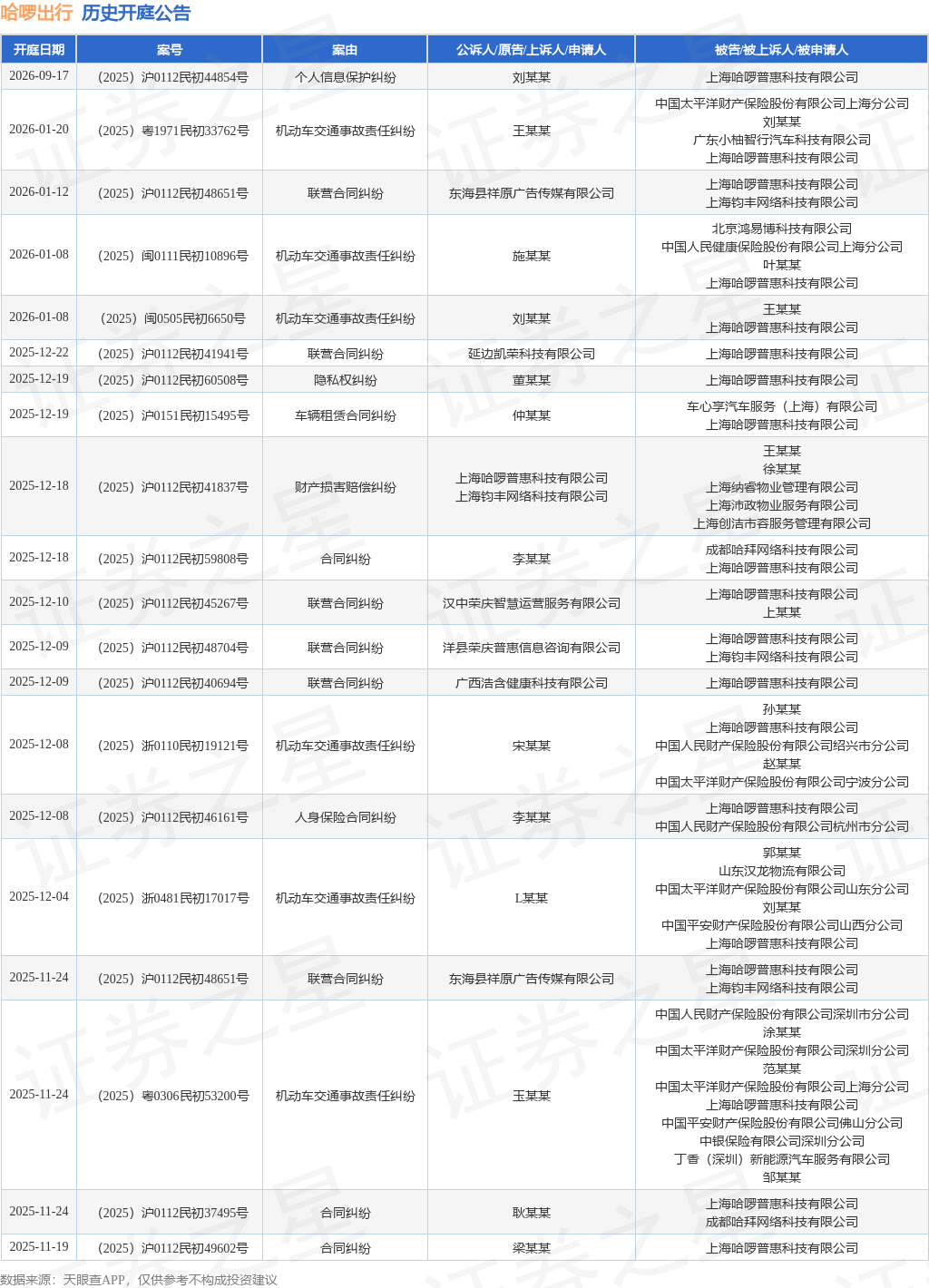 案号:(2025)沪0112民初46161号根据统计,近一年内以上海哈啰普惠科技有限公司为当事人的历史开庭公告有275则,其中案由为“机动车交通事故责任纠纷”的公告以77则居首,其次为“合同纠纷”有48则,“联营合同纠纷”有28则。历史开庭公告(前20条)如下: