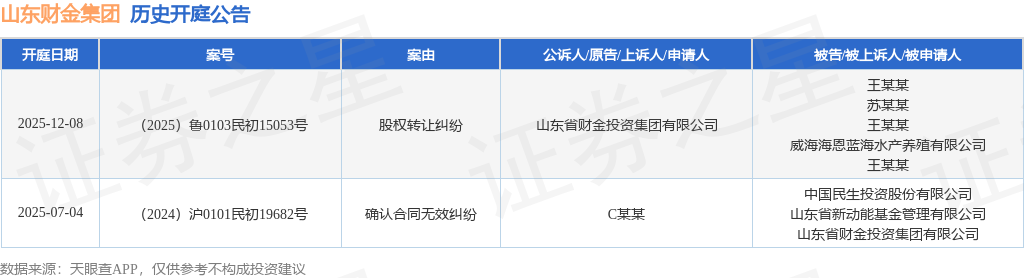 根据统计,近一年内以山东省财金投资集团有限公司为当事人的历史开庭公告有2则,其中案由为“确认合同无效纠纷”的公告以1则居首,其次为“股权转让纠纷”有1则。历史开庭公告如下:
