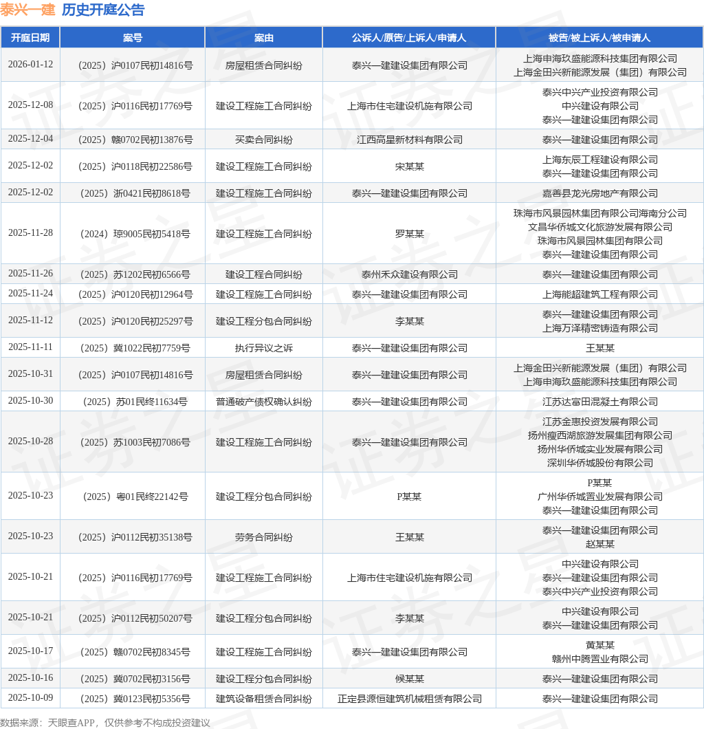 案号:(2025)沪0116民初17769号根据统计,近一年内以泰兴一建建设集团有限公司为当事人的历史开庭公告有171则,其中案由为“建设工程施工合同纠纷”的公告以58则居首,其次为“买卖合同纠纷”有25则,“建设工程分包合同纠纷”有22则。历史开庭公告(前20条)如下: