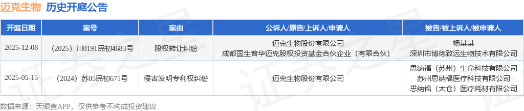 根据统计,近一年内以迈克生物股份有限公司为当事人的历史开庭公告有2则,其中案由为“侵害发明专利权纠纷”的公告以1则居首,其次为“股权转让纠纷”有1则。历史开庭公告如下: