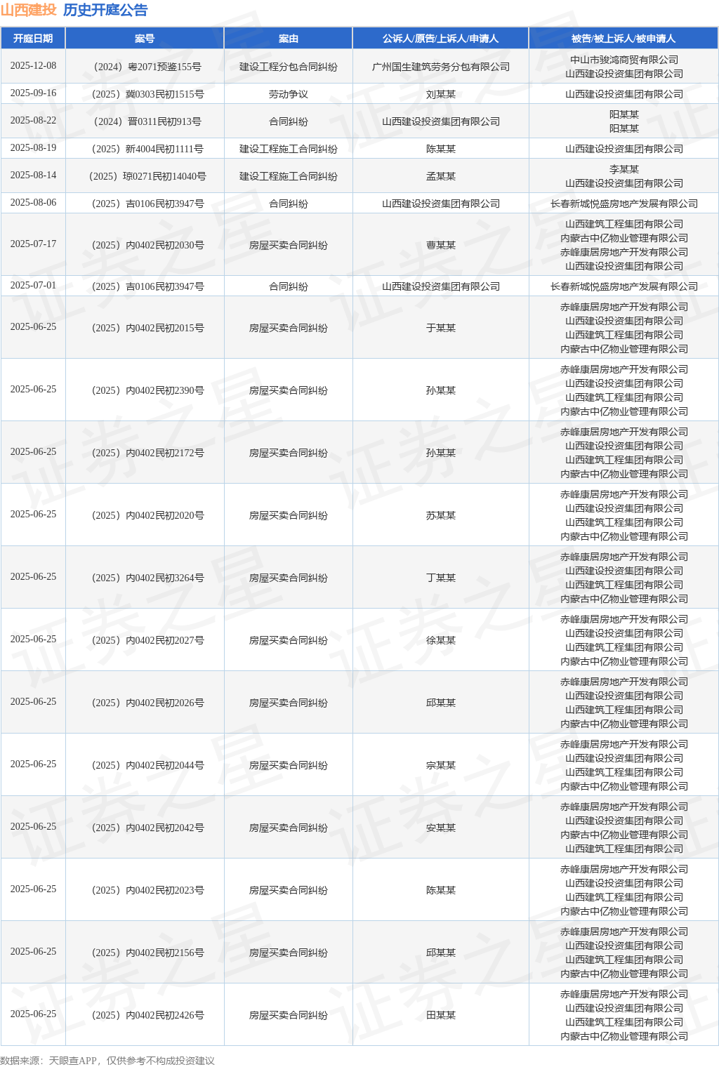 案号:(2024)粤2071预鉴155号根据统计,近一年内以山西建设投资集团有限公司为当事人的历史开庭公告有44则,其中案由为“房屋买卖合同纠纷”的公告以23则居首,其次为“买卖合同纠纷”有9则,“建设工程施工合同纠纷”有5则。历史开庭公告(前20条)如下: