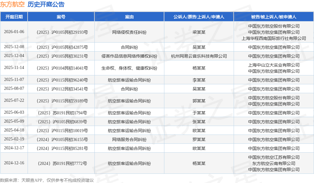 案号:(2025)沪0105民初42875号根据统计,近一年内以中国东方航空集团有限公司为当事人的历史开庭公告有13则,其中案由为“航空旅客运输合同纠纷”的公告以7则居首,其次为“合同纠纷”有2则,“侵害作品信息网络传播权纠纷”有1则。历史开庭公告如下: