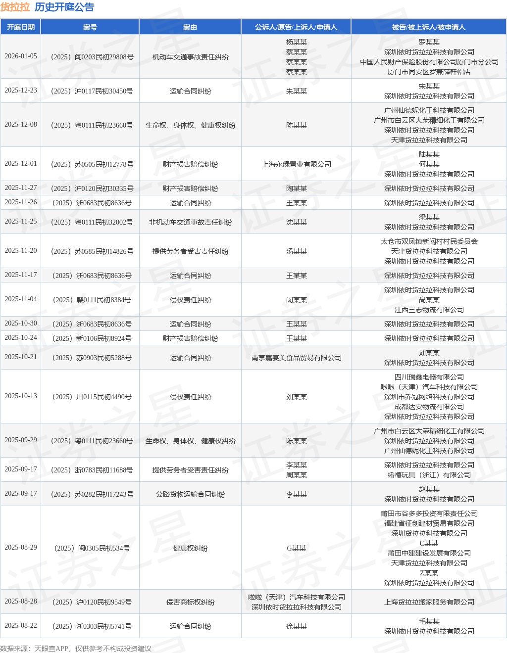 案号:(2025)粤0111民初23660号根据统计,近一年内以深圳依时货拉拉科技有限公司为当事人的历史开庭公告有82则,其中案由为“机动车交通事故责任纠纷”的公告以23则居首,其次为“运输合同纠纷”有17则,“公路货物运输合同纠纷”有7则。历史开庭公告(前20条)如下: