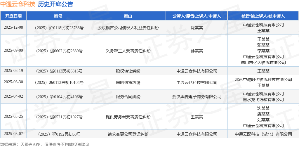 案号:(2025)沪0118民初23788号根据统计,近一年内以中通云仓科技有限公司为当事人的历史开庭公告有7则,其中案由为“义务帮工人受害责任纠纷”的公告以1则居首,其次为“提供劳务者受害责任纠纷”有1则,“服务合同纠纷”有1则。历史开庭公告如下: