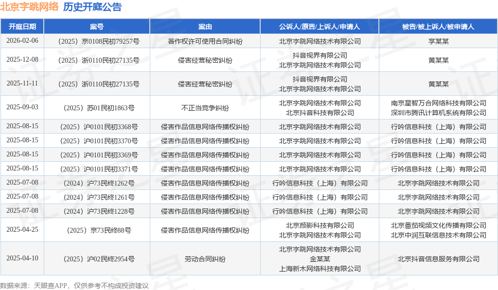 案号:(2025)浙0110民初27135号根据统计,近一年内以北京字跳网络技术有限公司为当事人的历史开庭公告有13则,其中案由为“侵害作品信息网络传播权纠纷”的公告以8则居首,其次为“侵害经营秘密纠纷”有2则,“不正当竞争纠纷”有1则。历史开庭公告如下:
