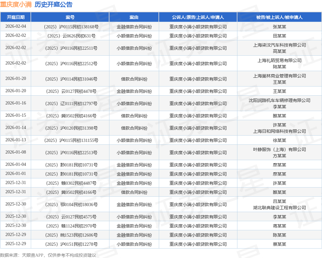 案号:(2025)苏0623民初7527号根据统计,近一年内以重庆度小满小额贷款有限公司为当事人的历史开庭公告有2265则,其中案由为“小额借款合同纠纷”的公告以1166则居首,其次为“金融借款合同纠纷”有461则,“借款合同纠纷”有404则。历史开庭公告(前20条)如下: