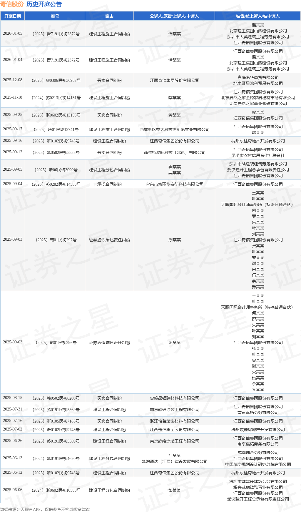 案号:(2025)粤0306民初36967号根据统计,近一年内以江西奇信集团股份有限公司为当事人的历史开庭公告有51则,其中案由为“买卖合同纠纷”的公告以13则居首,其次为“建设工程施工合同纠纷”有8则,“建设工程合同纠纷”有5则。历史开庭公告(前20条)如下: