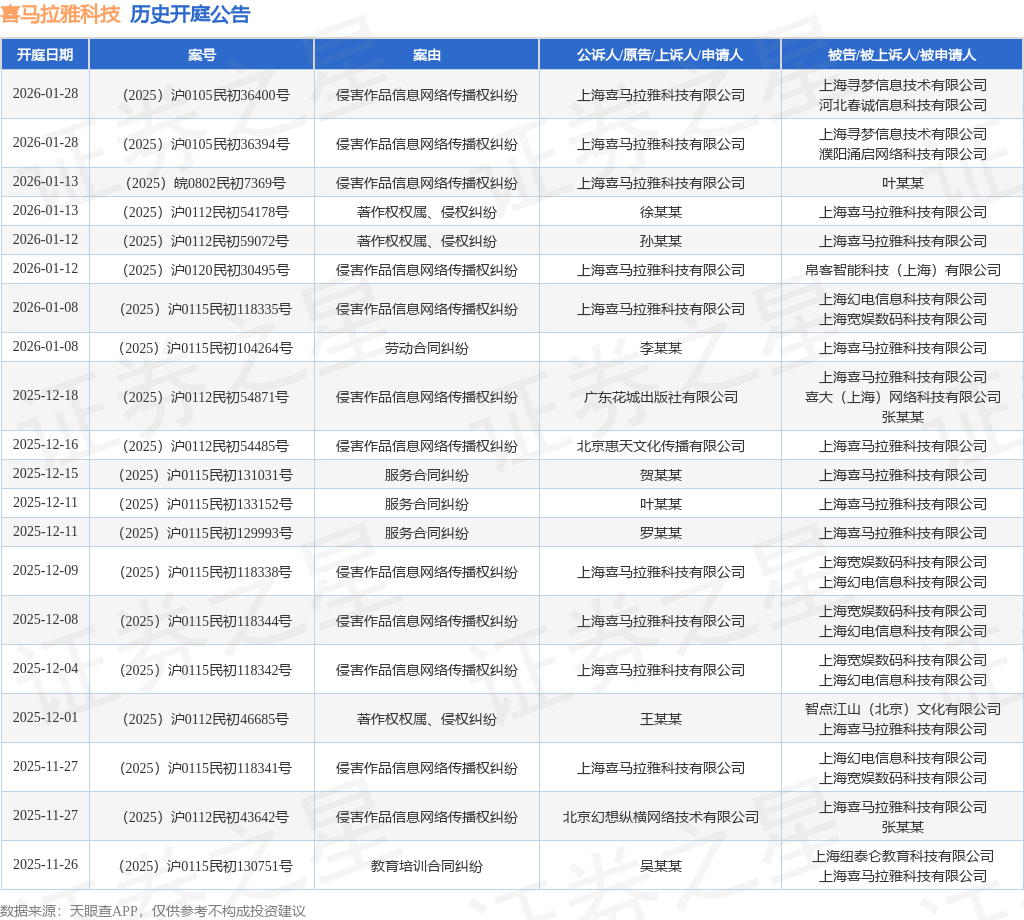案号:(2025)沪0115民初118344号根据统计,近一年内以上海喜马拉雅科技有限公司为当事人的历史开庭公告有174则,其中案由为“侵害作品信息网络传播权纠纷”的公告以69则居首,其次为“著作权权属、侵权纠纷”有52则,“服务合同纠纷”有19则。历史开庭公告(前20条)如下: