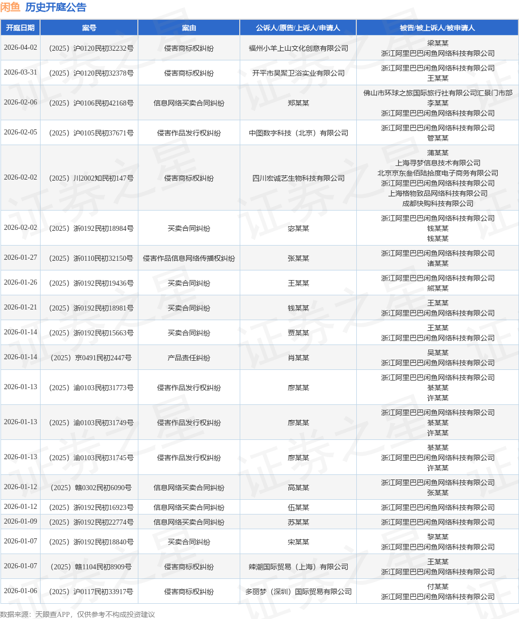 案号:(2025)沪0104民初25445号根据统计,近一年内以浙江阿里巴巴闲鱼网络科技有限公司为当事人的历史开庭公告有768则,其中案由为“信息网络买卖合同纠纷”的公告以141则居首,其次为“网络服务合同纠纷”有118则,“侵害商标权纠纷”有113则。历史开庭公告(前20条)如下: