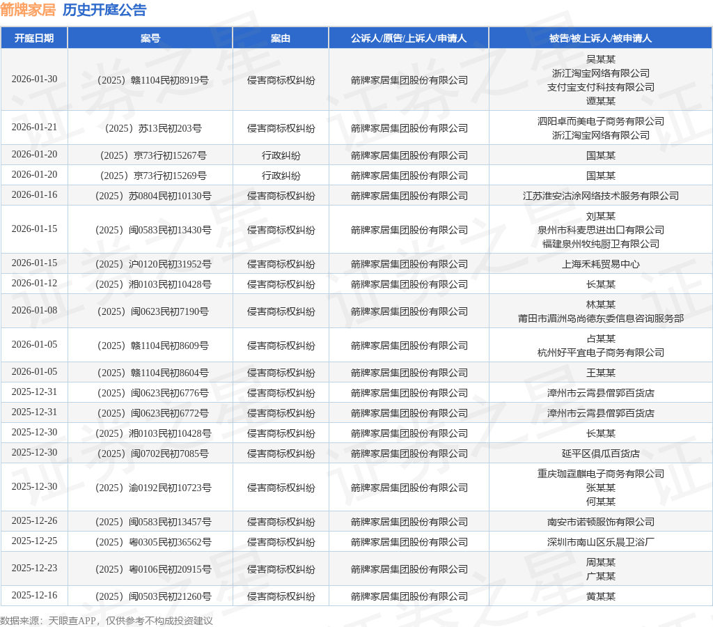 案号:(2025)浙0110民初32314号根据统计,近一年内以箭牌家居集团股份有限公司为当事人的历史开庭公告有485则,其中案由为“侵害商标权纠纷”的公告以424则居首,其次为“商标权权属、侵权纠纷”有18则,“行政纠纷”有8则。历史开庭公告(前20条)如下: