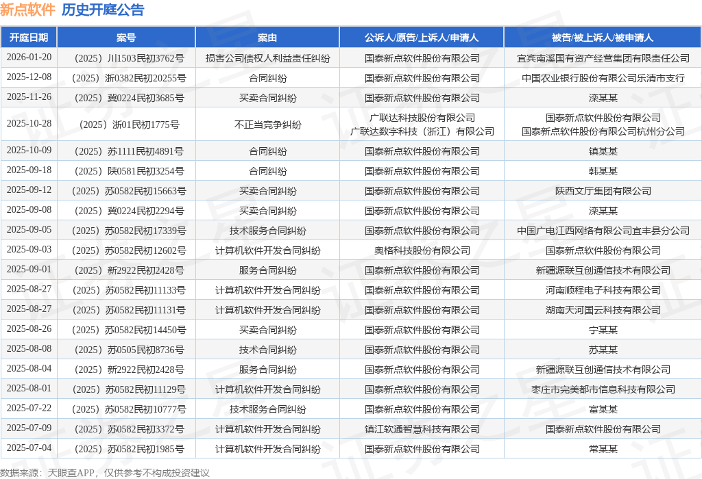 案号:(2025)浙0382民初20255号根据统计,近一年内以国泰新点软件股份有限公司为当事人的历史开庭公告有110则,其中案由为“计算机软件开发合同纠纷”的公告以53则居首,其次为“买卖合同纠纷”有20则,“技术服务合同纠纷”有15则。历史开庭公告(前20条)如下: