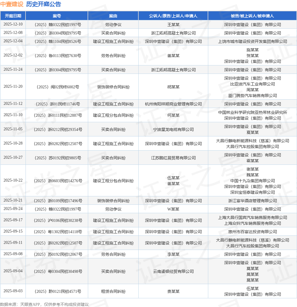 案号:(2025)浙0304民初9795号根据统计,近一年内以深圳中壹建设(集团)有限公司为当事人的历史开庭公告有78则,其中案由为“劳务合同纠纷”的公告以27则居首,其次为“买卖合同纠纷”有13则,“建设工程施工合同纠纷”有11则。历史开庭公告(前20条)如下: