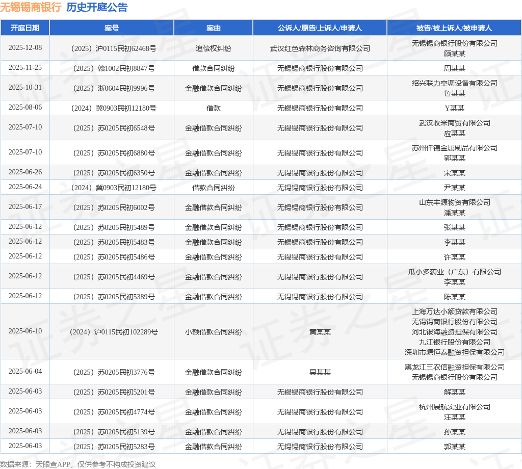 案号:(2025)沪0115民初62468号根据统计,近一年内以无锡锡商银行股份有限公司为当事人的历史开庭公告有161则,其中案由为“金融借款合同纠纷”的公告以154则居首,其次为“借款合同纠纷”有3则,“保证合同纠纷”有1则。历史开庭公告(前20条)如下: