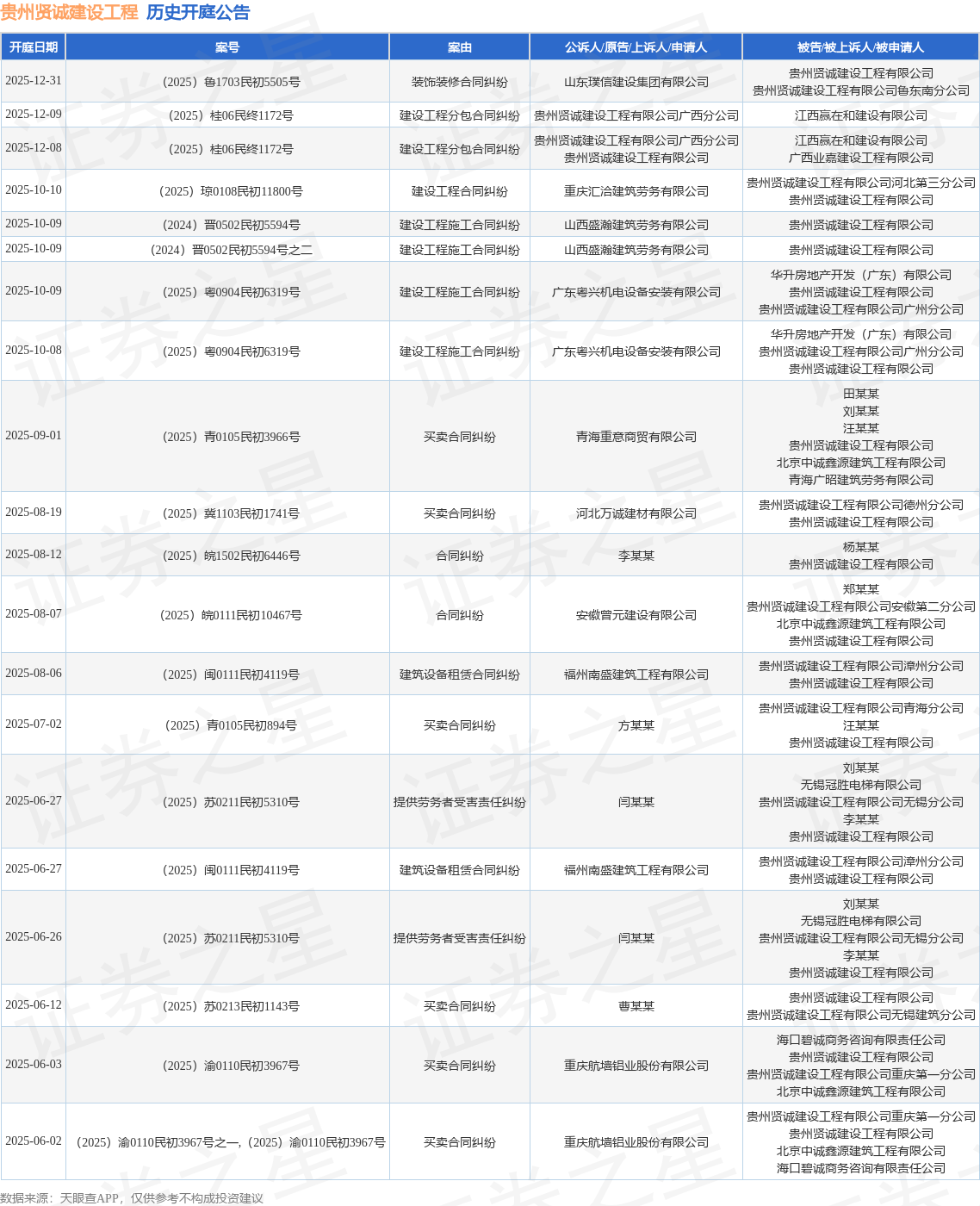 案号:(2025)桂06民终1172号根据统计,近一年内以贵州贤诚建设工程有限公司为当事人的历史开庭公告有37则,其中案由为“买卖合同纠纷”的公告以11则居首,其次为“建设工程施工合同纠纷”有8则,“建设工程分包合同纠纷”有4则。历史开庭公告(前20条)如下: