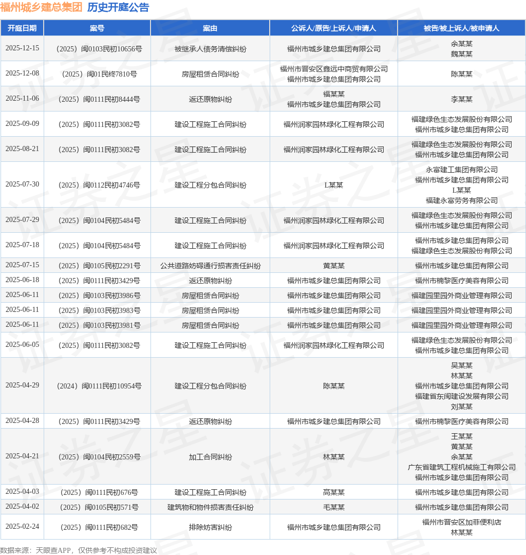 案号:(2025)闽01民终7810号根据统计,近一年内以福州市城乡建总集团有限公司为当事人的历史开庭公告有30则,其中案由为“建设工程施工合同纠纷”的公告以9则居首,其次为“房屋租赁合同纠纷”有5则,“建设工程分包合同纠纷”有3则。历史开庭公告(前20条)如下: