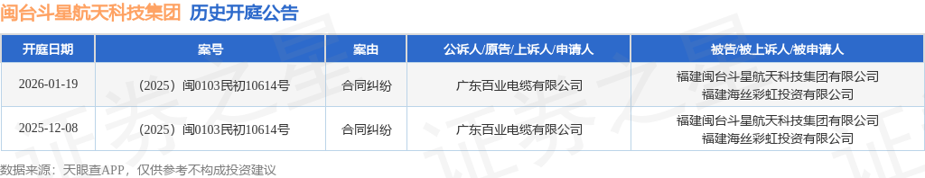 证券之星消息,根据天眼查APP显示,近日公布了一则福建闽台斗星航天科技集团有限公司作为被告/被上诉人的开庭公告,详细内容如下: