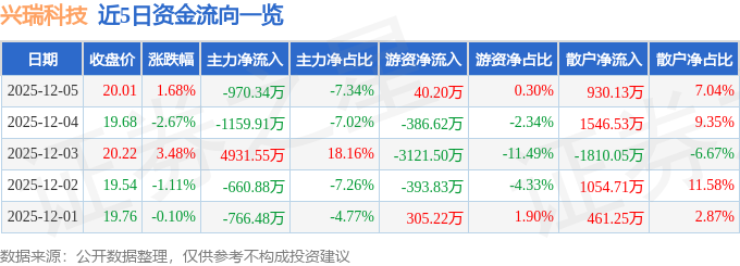 证券之星消息,截至2025年12月5日收盘,兴瑞科技(002937)报收于20.01元,上涨1.68%,换手率2.23%,成交量6.62万手,成交额1.32亿元。