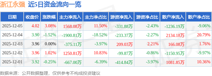 证券之星消息,截至2025年12月5日收盘,浙江永强(002489)报收于4.02元,上涨3.08%,换手率1.8%,成交量34.4万手,成交额1.36亿元。