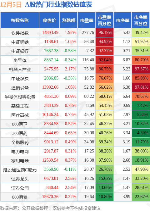 热门行业指数方面,软件指数的市盈率百分位较高,为96.19%。而800消费的市盈率百分位较低,为10.8%。