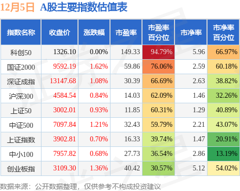 A股主要宽基指数方面,科创50的市盈率百分位较高,为94.79%。而创业板指的市盈率百分位较低,为30.57%。