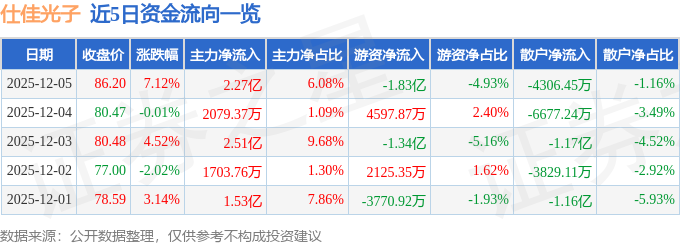 12月5日的资金流向数据方面,主力资金净流入2.27亿元,占总成交额6.08%,游资资金净流出1.83亿元,占总成交额4.93%,散户资金净流出4306.45万元,占总成交额1.16%。