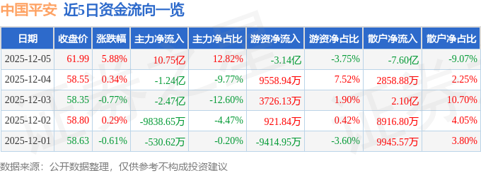 证券之星消息,截至2025年12月5日收盘,中国平安(601318)报收于61.99元,上涨5.88%,换手率1.29%,成交量137.79万手,成交额83.85亿元。