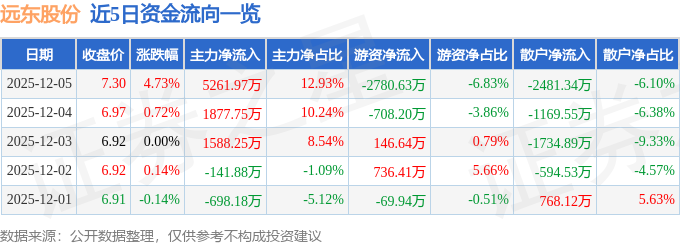证券之星消息,截至2025年12月5日收盘,远东股份(600869)报收于7.3元,上涨4.73%,换手率2.53%,成交量56.19万手,成交额4.07亿元。