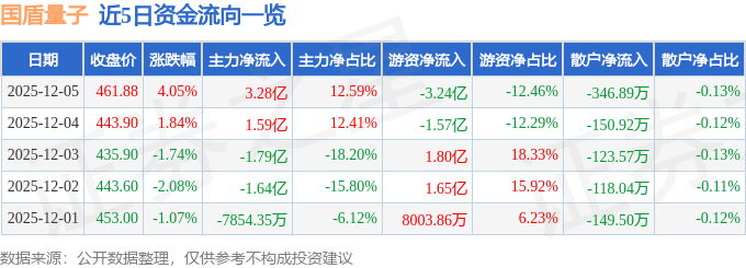 证券之星消息,截至2025年12月5日收盘,国盾量子(688027)报收于461.88元,上涨4.05%,换手率7.0%,成交量5.63万手,成交额26.02亿元。