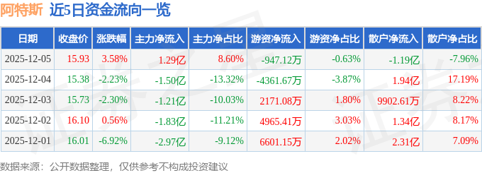 证券之星消息,截至2025年12月5日收盘,阿特斯(688472)报收于15.93元,上涨3.58%,换手率6.77%,成交量94.34万手,成交额14.95亿元。