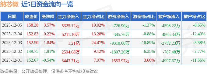 12月5日的资金流向数据方面,主力资金净流入5325.12万元,占总成交额10.02%,游资资金净流出726.9万元,占总成交额1.37%,散户资金净流出4598.22万元,占总成交额8.65%。