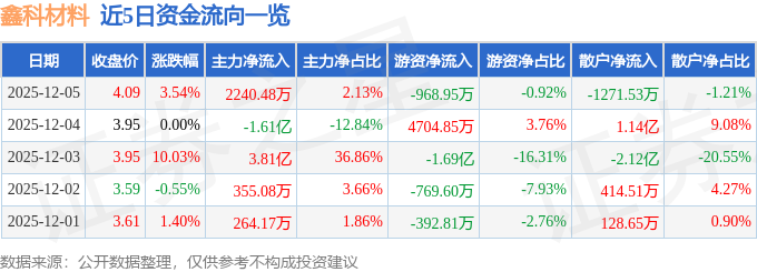 证券之星消息,截至2025年12月5日收盘,鑫科材料(600255)报收于4.09元,上涨3.54%,换手率14.47%,成交量261.34万手,成交额10.54亿元。