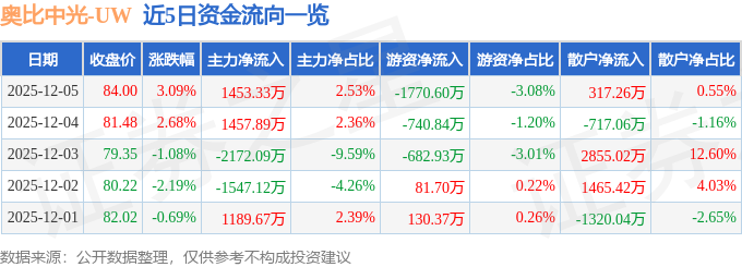 证券之星消息,截至2025年12月5日收盘,奥比中光(688322)报收于84.0元,上涨3.09%,换手率2.37%,成交量6.91万手,成交额5.75亿元。