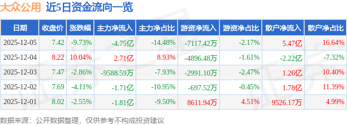 证券之星消息,截至2025年12月5日收盘,大众公用(600635)报收于7.42元,下跌9.73%,换手率17.86%,成交量432.11万手,成交额32.85亿元。