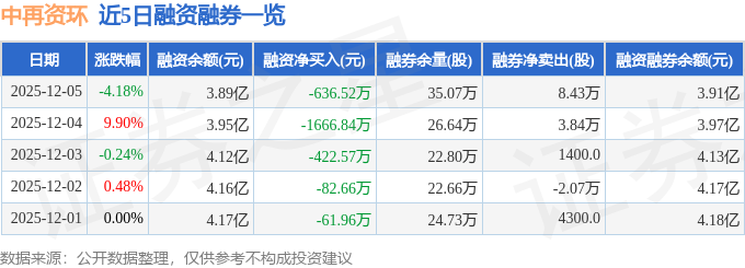 中再资环融资融券信息显示,融资方面,当日融资买入3046.5万元,融资偿还3683.02万元,融资净偿还636.52万元。融券方面,融券卖出8.62万股,融券偿还1900.0股,融券余量35.07万股,融券余额152.92万元。融资融券余额3.91亿元。
