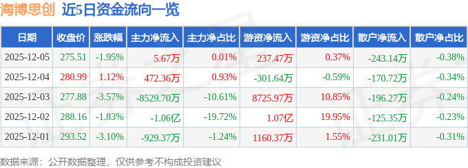 证券之星消息,截至2025年12月5日收盘,海博思创(688411)报收于275.51元,下跌1.95%,换手率6.13%,成交量2.32万手,成交额6.43亿元。