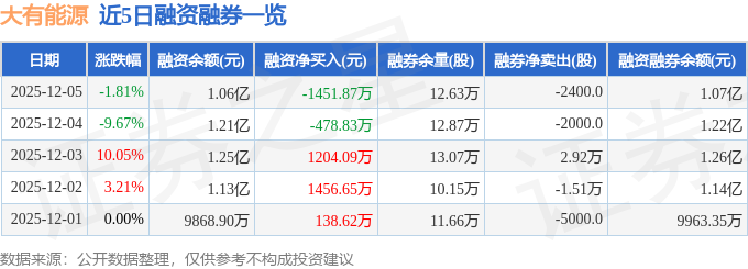 大有能源融资融券信息显示,融资方面,当日融资买入3866.78万元,融资偿还5318.66万元,融资净偿还1451.87万元。融券方面,融券卖出3900.0股,融券偿还6300.0股,融券余量12.63万股,融券余额103.06万元。融资融券余额1.07亿元。