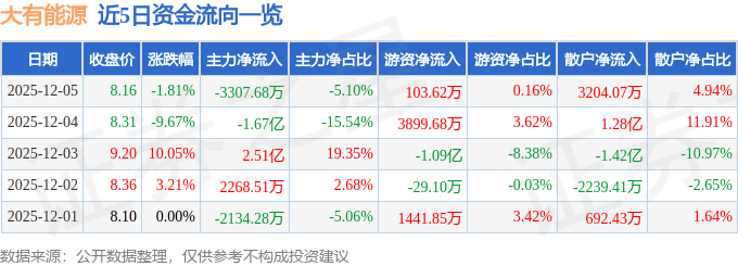 证券之星消息,截至2025年12月5日收盘,大有能源(600403)报收于8.16元,下跌1.81%,换手率3.38%,成交量80.92万手,成交额6.49亿元。