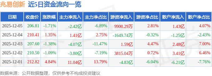 12月5日的资金流向数据方面,主力资金净流出2.42亿元,占总成交额6.89%,游资资金净流入9900.29万元,占总成交额2.81%,散户资金净流入1.43亿元,占总成交额4.07%。