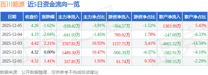 证券之星消息,截至2025年12月5日收盘,百川能源(600681)报收于4.26元,下跌1.62%,换手率4.23%,成交量56.64万手,成交额2.4亿元。