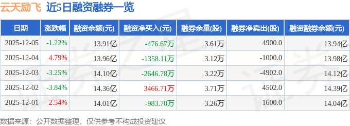 云天励飞融资融券信息显示,融资方面,当日融资买入7092.52万元,融资偿还7569.18万元,融资净偿还476.67万元。融券方面,融券卖出4900.0股,融券偿还0.0股,融券余量3.61万股,融券余额263.52万元。融资融券余额13.94亿元。