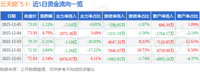 证券之星消息,截至2025年12月5日收盘,云天励飞(688343)报收于73.03元,下跌1.22%,换手率2.91%,成交量7.68万手,成交额5.57亿元。