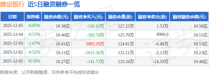 建设银行融资融券信息显示,融资方面,当日融资买入5509.9万元,融资偿还5630.03万元,融资净偿还120.13万元。融券方面,融券卖出4.45万股,融券偿还2.92万股,融券余量127.23万股,融券余额1184.51万元。融资融券余额10.5亿元。