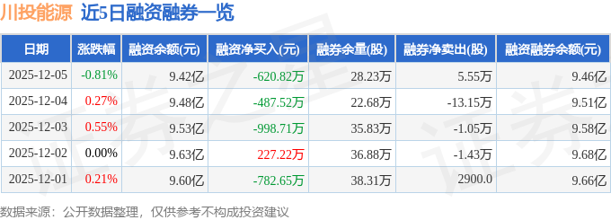 川投能源融资融券信息显示,融资方面,当日融资买入2528.76万元,融资偿还3149.57万元,融资净偿还620.82万元。融券方面,融券卖出6.4万股,融券偿还8500.0股,融券余量28.23万股,融券余额412.44万元。融资融券余额9.46亿元。