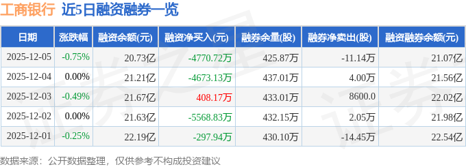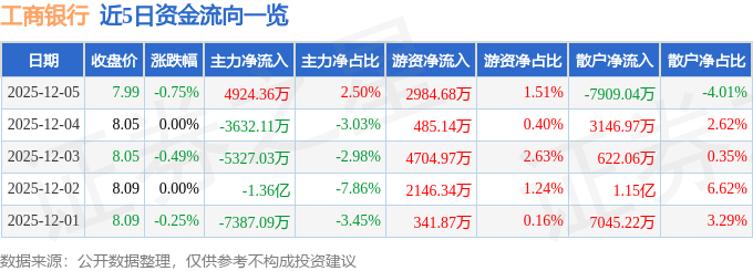 证券之星消息,截至2025年12月5日收盘,工商银行(601398)报收于7.99元,下跌0.75%,换手率0.09%,成交量246.15万手,成交额19.71亿元。